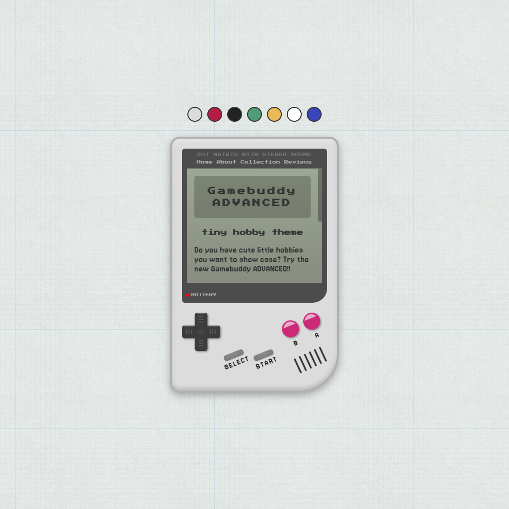 A website theme inspired by retro handheld consoles, primarily the Nintendo Game Boy. Click the color swatches at the top to swap out the Gamebuddy's case!