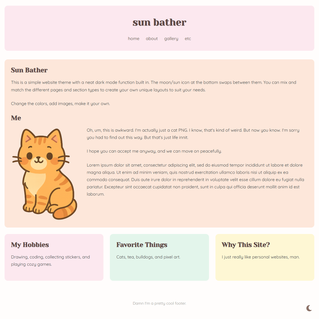 Free website template with a pastel theme and dark mode toggle. Changing the colors and fonts is an easy way to make this one your own.